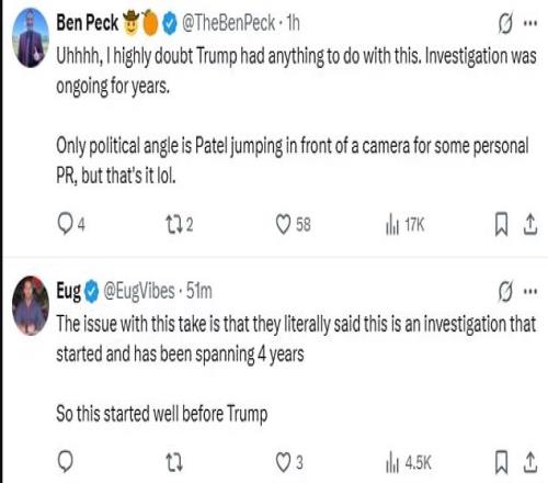 另一名网友说:“调查跨越多年,怎么可能和川普扯上关系?唯一政治性的部分,是帕特尔想上镜罢了。”还有人讽刺道:“现在连FBI抓黑手党都能被说成川普阴谋,这简直是‘川普恐惧症’发作。”
