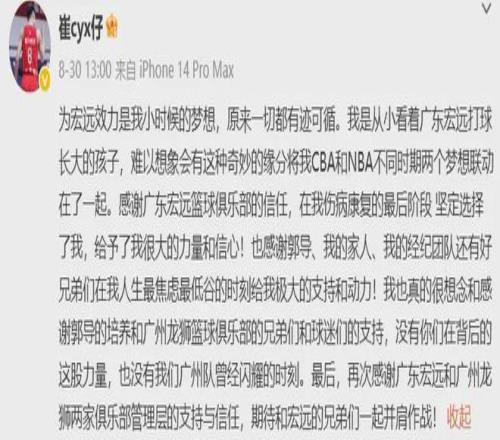崔永熙本人对能够为广东队效力也是感到欣喜若狂,期待他的生涯新篇章。
