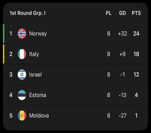 北京时间11月17日,世预赛欧洲区小组赛I组迎来收官之战,挪威客场迎战意大利。本场比赛,意大利队由埃斯波西托先拔头筹,取得1-0领先。但在比赛最后30分钟,挪威队发起反攻。努萨爆射破门,哈兰德2分钟2球,拉尔森补时再进一球。最终意大利1-4比不敌挪威,惨遭对手双杀。而挪威队豪取8连胜以小组第一的身份直通2026年美加墨世界杯。